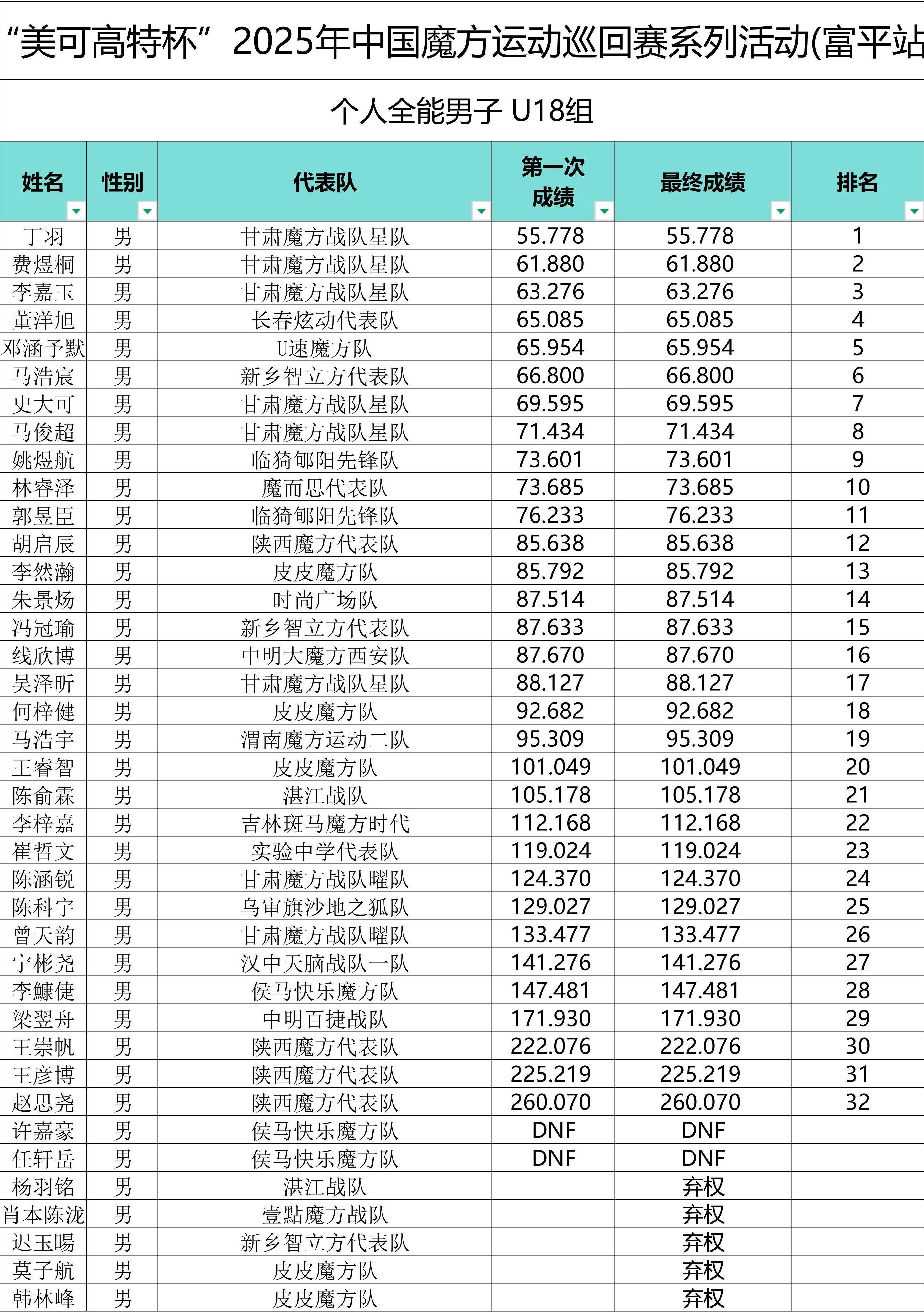 中国魔方运动巡回赛系列活动 (富平站) - 个人单项赛事成绩(个人全能男子组) 2025-10-21 19 北京魔方未来 上一篇:中国魔方运动巡回赛系列活动 (富平站) - 个人单项赛事成绩(三阶盲拧) 下一篇:中国魔方运动巡回赛系列活动 (富平站) - 个人单项赛事成绩(个人全能女子组)